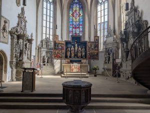 Denn: Die Crailsheimer Augmented-Reality-Tour eignet sich für alle Altersklassen. Sie lässt Verborgenes sichtbar werden und weckt Interesse an der Crailsheimer Stadtgeschichte. Insgesamt gibt es zwölf Stationen: sechs im Inneren der Johanneskirche, sechs weitere im Außenbereich. Toll ist es, den Altar der Kirche virtuell zu öffnen und wieder zu schließen. Imposant ist auch der Vortrag von Ada Isensee, die im Video ihre bunten, selbst gestalteten Fenster in den Mittelpunkt rückt. Oder wie wäre es mit einem anmutigen Orgelspiel? Wenn ihr den kompletten Rundgang macht und alle digitalen Inhalte ladet, braucht ihr ungefähr anderthalb Stunden. Ich wünsche euch viel Spaß dabei!